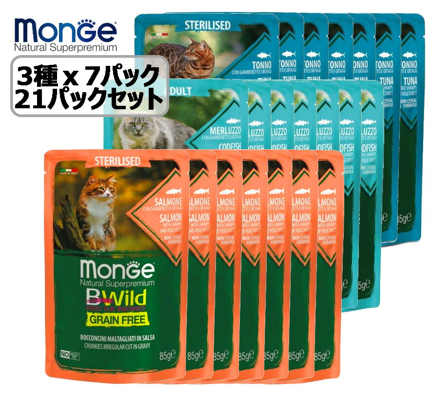 【猫】Monge Bwild パウチ ツナ・サーモン・タラの3種各7パック 合計85gx21パックセット キャットフード グレインフリー ウェットフード Bワイルド[M便 1/10]【SET】【PU1120】
