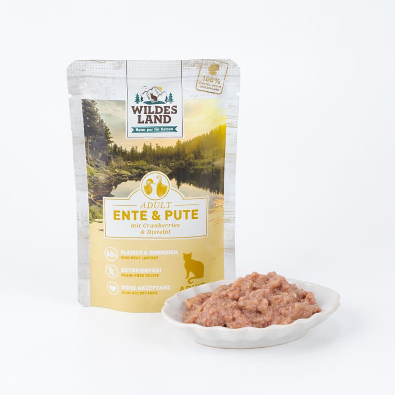 Wildes Land のウェット フード メニューで、天然かつ高品質の食材のみを使用したタンパク質が豊富で健康的な食事をペットに提供します。肉含有量が68%で、この食品には天然のタンパク質源のみが含まれており、純粋なベニバナ油の添加により特に許容性が高くなります。 私たち Wildes Land は、ペットの健康にとって適切な食事がいかに重要であるかを知っています。したがって、クラシック アダルト ラインのダック&ターキー ウェット フードは完全にグルテンと穀物を含まず、筋肉肉と内臓含有量が 68% の高品質なタンパク質源を提供するため、猫にバランスのとれたタンパク質が豊富な食事を保証します。 純粋なベニバナ油と厳選されたクランベリーを特別に添加することで、ペットに重要なビタミンや栄養素を十分に供給することが保証されています。 ダック&ターキーのウェットフードメニューには、保存料、着色料、香料などの添加物は含まれておらず、もちろん動物実験は行われておらず、ドイツで開発、製造されています。Wildes Land のウェットフード アヒル & ターキーは、あらゆる品種の成猫に適しています。 肉と内臓の比率が68%と高い たんぱく質が豊富 完全穀物不使用 天然で高品質な原料のみを使用 保存料、着色料、香料不使用 特に耐えられる 動物実験は行っていない 七面鳥 40% (ハツ、肉、レバー、ネック)、ブイヨン 28.7%、アヒル 28% (ハツ、レバー)、クランベリー 2%、ミネラル 1%、ベニバナ油 0.3% 粗タンパク質10.3%、粗脂肪5.6%、粗灰分2.5%、粗繊維0.4%、水分80%、カルシウム0.20%0.26%、リン0.15%0.19% 1kgあたりの添加剤: ビタミンD3 200 IU、亜鉛(硫酸亜鉛/一水和物として)15 mg、マンガン(硫酸マンガンII/一水和物として)3 mg、ヨウ素(ヨウ素酸カルシウム無水物)0.75 mg、タウリン 1,500 mg。 ※食品に含まれるリンは天然由来のものであり、添加物は一切使用しておりません。原料は天然物ですので、当然価値は変動します。動物に十分なカルシウムを供給し、適切なカルシウムとリンの比率を達成するために、肉には少量しか含まれないカルシウムが飼料に追加されます。これにより、それぞれの量の範囲が得られます。◆ ワイルドランドについて ◆ モットー: 純粋な自然! Wildes Land は、犬と猫のための種に適した自然な栄養を意味します。ペットの自然なニーズに合わせた高品質のドッグフードとキャットフードを製造しています。私たちの料理は、余分な肉、穀物やグルテンを含まないこと、高いレベルの受容性と忍容性を備えた料理、貴重な野生のハーブの使用を特徴としています。私たちにとって、動物たちへの愛情から、「純粋な自然」が?そのままボウルに入ってきます。 我々の使命:犬と猫にとってより良く、より健康的な栄養を Wildes Land はこの傾向を非常に早くから認識し、それ以来、誠実な情熱と献身をもって一貫してそれを実行してきました。 2014 年以来、私たちの使命は、より良く、より健康的な栄養を通じてできるだけ多くの犬や猫の生活にプラスの影響を与え、それによって彼らの愛する人々、つまりあなたと一緒に長く幸せな時間を過ごせるようにすることでした。 ほとんどが動物の飼い主である Wildes Land チームは、この使命を 100% 認識し、多くの情熱を注いでいます。これにより、お子様が美味しいと感じるだけでなく、本当に良いと感じる素晴らしい製品が生まれます。 私たちの約束 信頼は餌を与えることから始まる 私たちの動物は、動物たちに餌を与えるときに私たちが彼らにとって重要な栄養素をすべて提供し、種に適した食事を提供していることを信頼しています。これにより、ペットが適切な栄養を摂取して健康で長生きできるようにするという大きな責任が生じます。 ●新鮮なお肉がたっぷり ●高品質の原材料と成分のみを使用 ●穀物不使用/グルテン不使用 ●高い受容性と忍容性 ●着色料、香料、保存料不使用 ●動物実験は行っていません ●貴重な野草入り 私達の価値 自然界では、私たちの犬や猫は、走ったり、飛んだり、泳いだりするものを追いかけるのが大好きです。そこで私たちは、科学的知見に基づいて、四本足の動物たちの自然な狩猟本能に対応し、健康をサポートする、その種に適したオリジナルの食事を提供することを目指しています。なぜなら、たとえ最も小さなチワワであっても、本来の野生性は依然として見出されるものであり、それがまさに私たちがペットを愛する理由だからです。 このオリジナリティと自然さを維持するために、ダックスフントからマスティフまで、穏やかな飼い猫から大胆な外猫まで、私たちは最高のものだけを、ワイルドランドの純粋な自然とともに提供したいと考えています。 それは、私たちワイルドランドでは、低品質の餌や不適切な餌が動物の健康にどれほど大きな影響を与えるかを知っているからです。しかし、私たちはまた、種に適した給餌と動物のニーズの認識がどのようなプラスの効果をもたらす可能性があるか