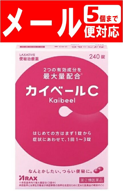 [関連]:アラクス カイベールC 便秘薬 便秘治療薬 [5個までメール便にて発送] ※メール便をご希望の方は、購入画面「お支払いと配送方法」ページ内「配送方法の選択」にて「メール便(日本郵政)」となっていることをご確認ください。 ※メール便対応数量を超える場合は、購入画面「お支払いと配送方法」ページにて「配送方法の選択」を「宅配便」に変更してください。 ●製品の特徴 時間がないからと,朝食を抜きにしたり便意を我慢したりすると,腸の運動・分泌に乱れが生じて便秘になってしまうこともあります。 便秘は,肌あれ・吹出物・腹部膨満などの症状を伴うことがあり,気がのらない一日を過ごしてしまうことにもなります。 カイベールCは,ビサコジルとセンノサイドの作用により自然に近いお通じが得られ,便秘に伴ういろいろな不快症状に対してもすぐれた効果をあらわします。 はじめての方はまず1錠から効き目をお試しください。 カイベールCはピンク色をした小粒の糖衣錠で,のみやすく,しかものむ人の症状に合わせ,錠数を調節して服用できます。 カイベールCは腸溶性のコーティングが施してあり,2つの成分が大腸に直接作用して確かな効果が期待できます。 ●効能・効果 便秘。 便秘に伴う次の症状の緩和:肌あれ,吹出物,頭重,のぼせ,食欲不振(食欲減退),腹部膨満,腸内異常醗酵,痔●医薬品区分:一般用医薬品 ●薬効分類:瀉下薬(下剤) はじめての方はまず1錠から すぐれた効き目の便秘治療薬 飲みやすいピンクの小粒タイプ