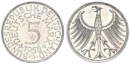 5 DM J.387 銀貨 1958 J 小さなエッジの不規則性、UNC 94421