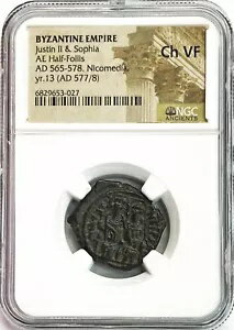 AD 565-578 ビザンチン帝国 AE ハーフフォリス ジャスティン 2 世 & ソフィア コイン NGC CHOICE VF