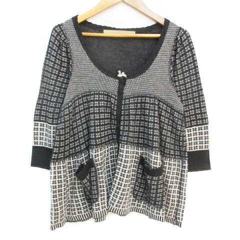 【中古】イリアンローブ iliann loeb ニットカーディガン ミドル丈 七分袖 ラウンドネック リボン 総柄 ウール混 F 白 黒 ホワイト ブラック /FF16 レディース 【ベクトル 古着】 231030