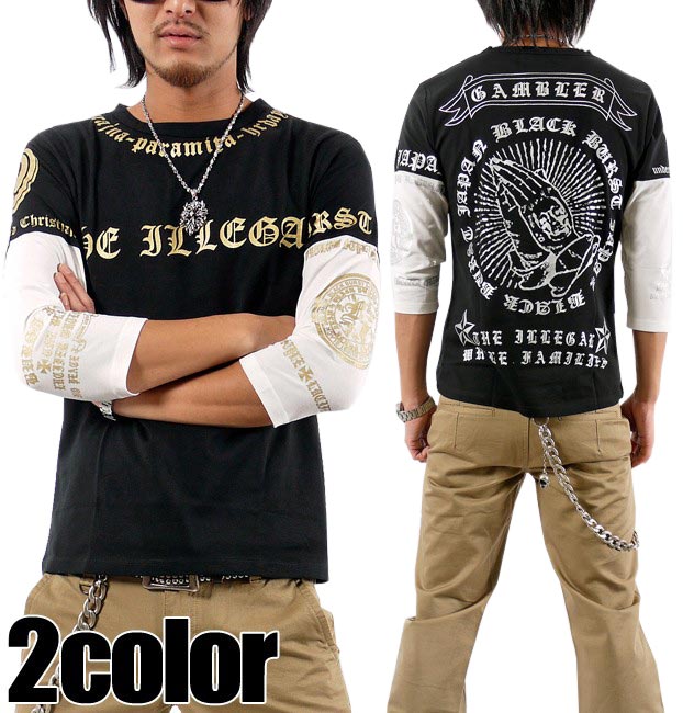 【閉店セール】THE ILLEGAL 三つ巴バックプレイハンド プリント 7分袖Tシャツ メンズファッション BURST JAPAN オラオラ系 美シルエット ブラック カジュアル ロック ビター系 BURST オラオラ系 美シルエット ブラック カジュアル ロック ビター系 大人系