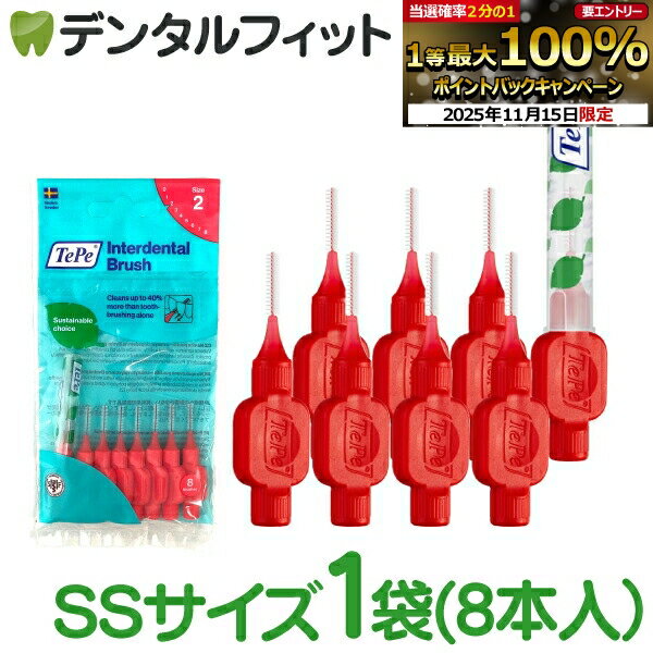 TePe インターデンタルブラシ SS Tepeの歯間ブラシ。 付属のキャップは、ブラシを守ることはもちろん、後部に付けることで持ち手としてもご使用いただけます。 【サイズ】SS(最少通過径:0.9mm) 【ワイヤ径】0.5mm 【カラー】レッド 【ブラシ部長さ】11.0mm 【製造国】Sweden 【内容】8本(キャップ1個) 【ご注意(免責)事項】 当店では、サイト上に最新の商品情報を掲載するよう努めておりますが、メーカーの都合等により、商品規格や仕様(容量・成分・パッケージ・原産国など)が予告なく変更される場合がございます。このため、実際にお届けする商品と商品ページ上の情報表記が異なる場合がございますので、ご使用前には必ずお届けした商品の商品ラベルや注意書きをご確認ください。また、商品情報についてページ表記以外の詳細が必要な場合は、メーカー等にお問合せください。単品買いならこちらがおススメ!ポスト投函が便利な送料無料ページはこちら