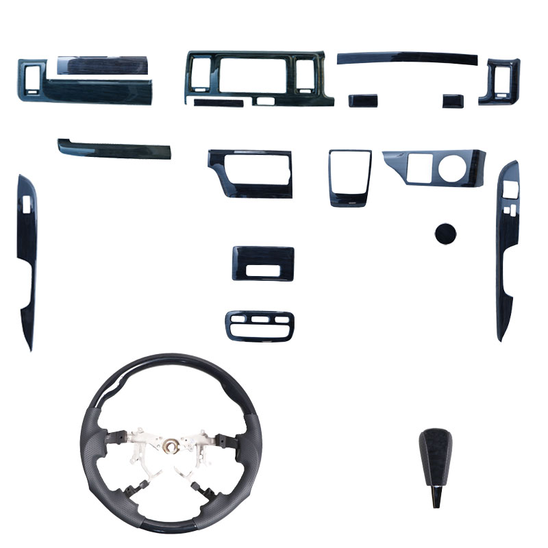 ハイエース 200系 4型 5型 6型 7型 標準用 スーパーGL 黒木目 インテリアパネル17P ステアリング シフトノブ セット ※8インチナビ・9インチナビはナビ部分のパネル取り付け不可 ※DX適合不可 【商品説明】 ■黒木目調 ■車種専用設計となっております。 ■インテリアパネル:材質はポリカーボネート・3D立体成型のウレタン塗装の商品になります。3D両面テープ付きで簡単にお取付けできます。(取り付け前に必ずパーツクリーナー等で脱脂作業を行ってください) ■ステアリング:純正エアバック対応・パンチングレザー&こぶ付きガングリップタイプ、ウレタン塗装で美しい商品になります。 ■シフトノブ:ウレタン塗装で美しい商品になります。 【注意事項】 ※商品は新品・未使用品になりますが、社外品の為、多少の小傷等がある場合が御座います。 ※とても壊れやすい商品ですのでお取り扱いには十分ご注意下さい。 ※商品は海外輸入品になり、部分的に若干の曲がりや穴位置・角度のズレなどがある場合がございます。 ※又、純正部品と違い加工や両面テープの追い足しを要する場合がございます。 ※両面テープを剥がして取り付ける前に必ず仮合わせをして下さい。