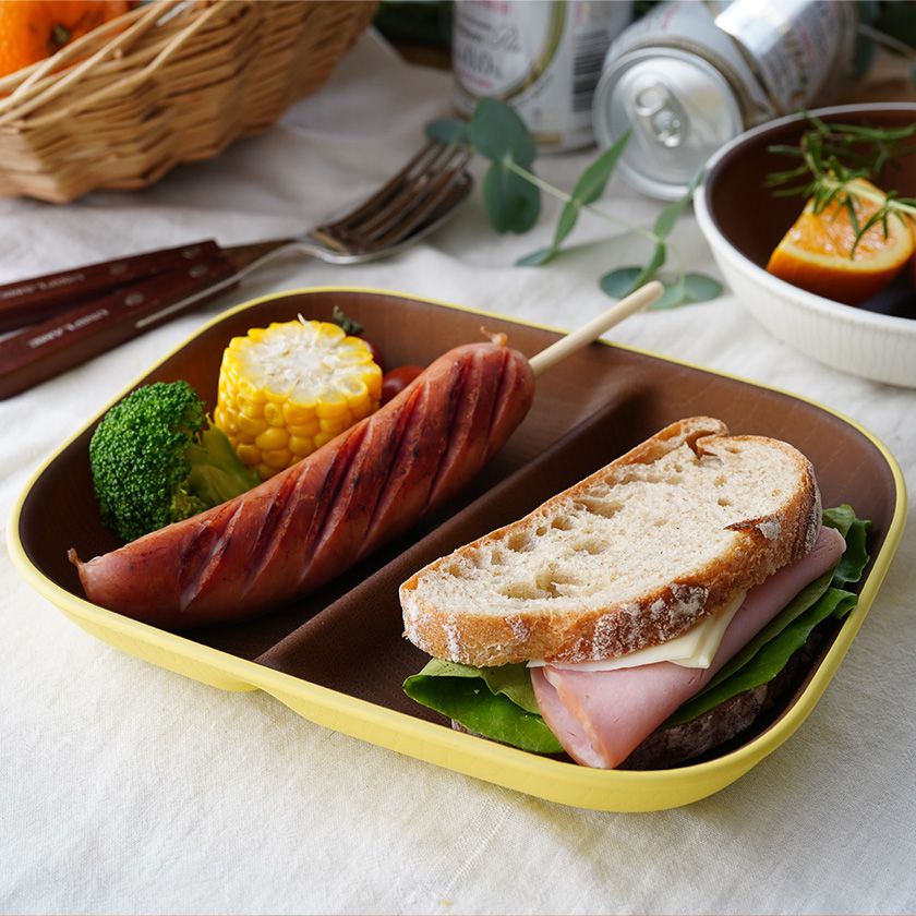 【クーポン配布中】isso ecco(イッソ エッコ) 木目調 長角ツインプレート 21.4cm イエロー (お取り寄せ品)ABS樹脂 // 日本製 アウトドア食器 電子レンジOK 食洗機OK 140℃ 耐熱 プレート 皿 長角皿 長方形 ふたつ 二つ 仕切り 2つ しきり皿 ワンプレート ランチ皿 朝食
