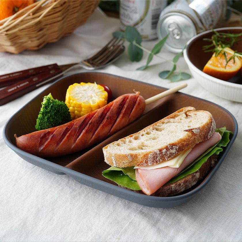 【クーポン配布中】isso ecco(イッソ エッコ) 木目調 長角ツインプレート 21.4cm グレー (お取り寄せ品) ABS樹脂 // 日本製 アウトドア食器 電子レンジOK 食洗機OK 140℃ 耐熱 プレート 皿 長角皿 長方形 ふたつ 二つ 仕切り 2つ しきり皿 ワンプレート ランチ皿 朝食 BBQ