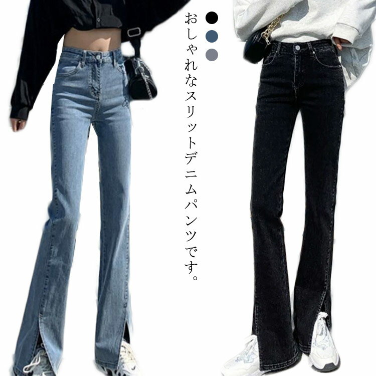 ベルボトム 秋冬 フレアパンツ ストレッチパンツ ジンズ ワイドパンツ ボトムス かわいい 美脚 ロング丈 レデイ—ス シンプル スリット おしゃれ かわいい きれいめ 春 夏 秋 冬 オールシーズン 着瘦せ デニムパンツ