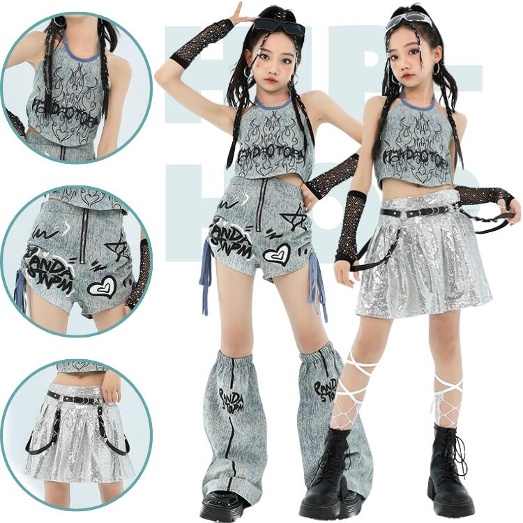 キッズダンス セットアップ トップス シャツ スカート レッグウォーマー デニム ジンズ 青 銀色 ブルー シルバー レディース 女の子 かっこいい ジャズダンス キッズ 子供 ヒップホップ おしゃれ 韓国風 可愛い ステージ衣装 ダンス衣装 ダンスウェア 応援団 演出服 HIPHOP