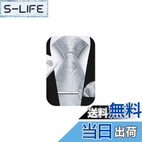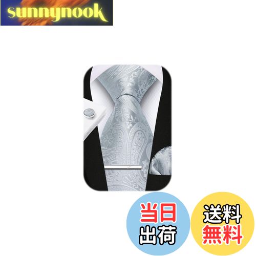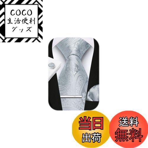 【送料無料】[HISDERN] シルバー結婚式 ネクタイ ペイズリー柄 ピン カフス ボタン チーフ シルク ビジネス 就活 入学式 卒業式 二次会 冠婚葬祭 高級 プレゼント おしゃれA4-02