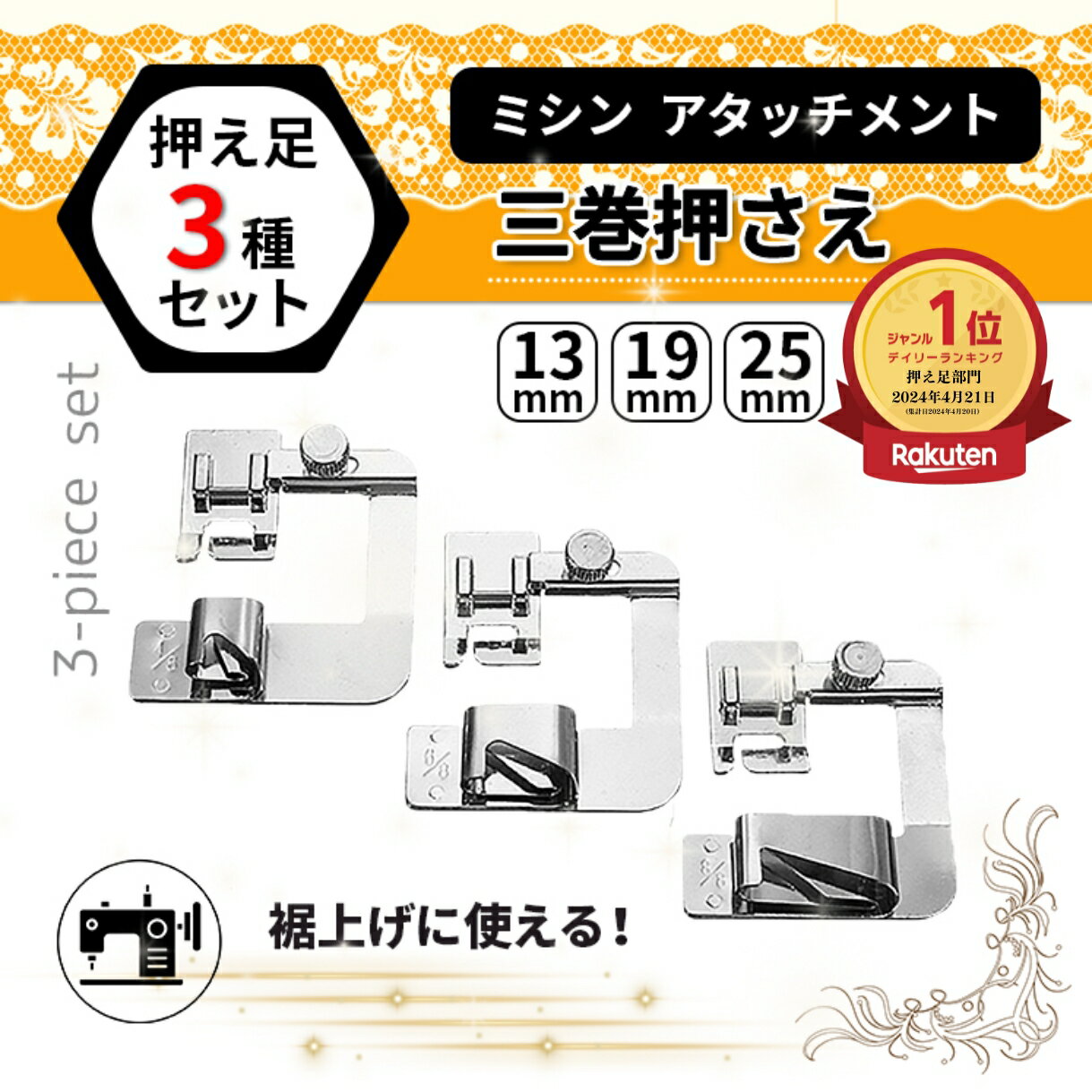 【3点まとめて5%引き★BLACKFRIDAY限定】 ミシン 押え足 三つ巻き押え 縁取り バインダー押え 裾上げ 3個セット 汎用 三ツ巻き押さえ 三巻き押え 三つ折り用 アタッチメント 三巻押え足 ジャガー ミシン 押え金 バインダー 【ランキング1位】