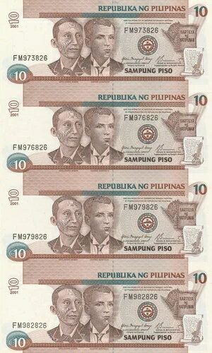 フィリピン 2001 10 ピソ 最終発行 未裁断シート 4 枚入り ホワイト ジープニー フォルダー