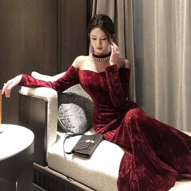 夏コーデ レディース ファッション 服 オシャレ カワイイ 女性用 シンプル 大人カワイイ 大きいサイズ 婦人服 フレンチ ワンライン ネック オフショルダー 長袖 ドレス パーティー バーガンディ イブニングドレス