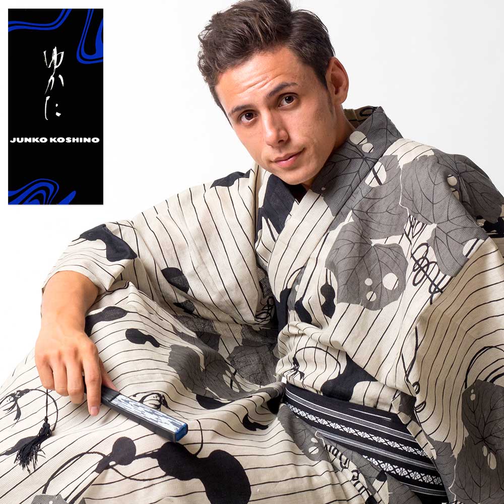男浴衣セット 【浴衣+帯+下駄+腰紐】JUNKO KOSHINO・お仕立て上がりメンズ浴衣4点セット 高級 綿麻 ブランドゆかた JUNKO KOSHINO(コシノジュンコ) 瓢箪 アイボリー地 黒 グレー