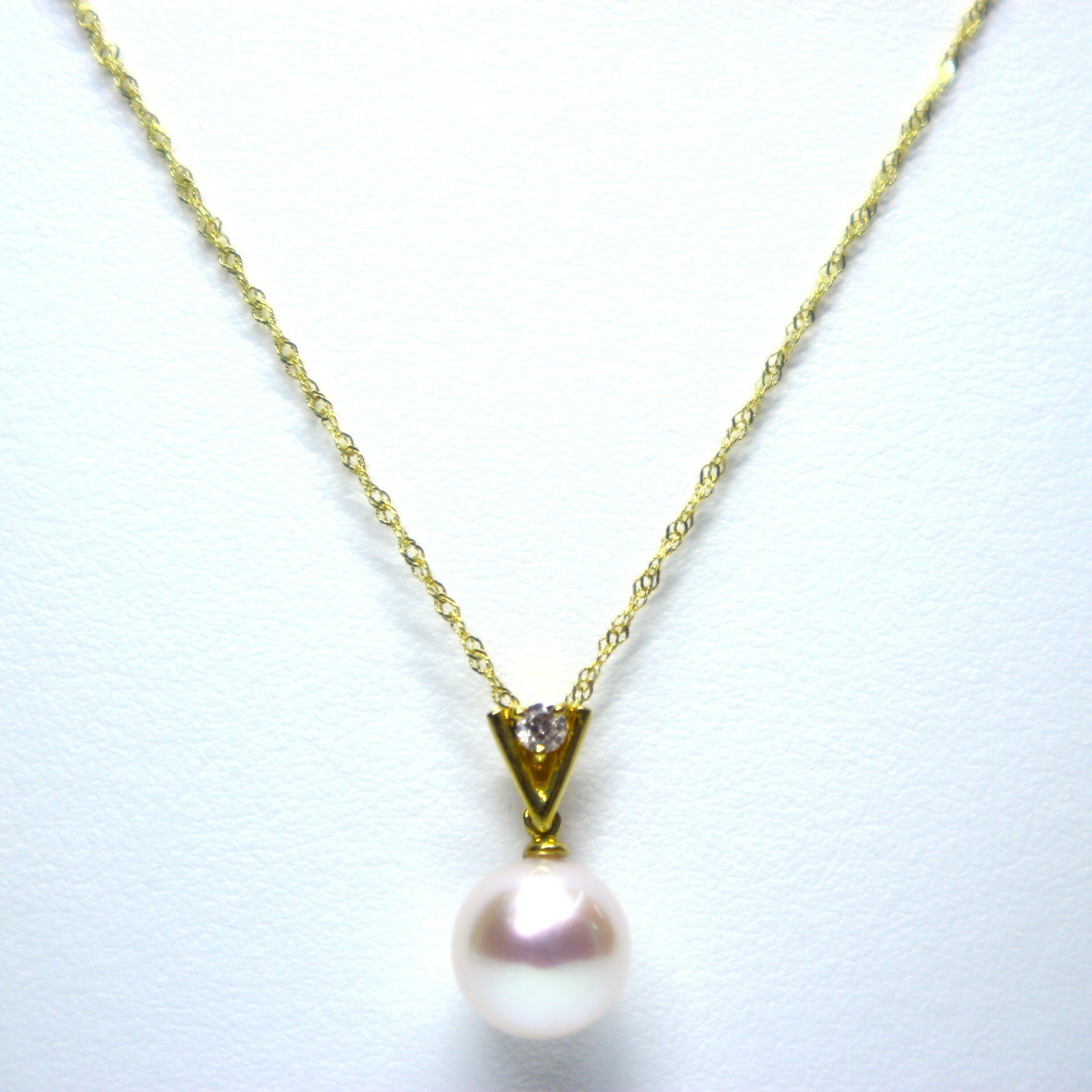 商品情報詳細※日本産本真珠であるアコヤ真珠(8.0mm珠)を使用しています。※金具はK18を使用しています。※チェーンの長さは約40cmです。※ダイヤモンドは0.05カラットです。※使用している真珠については、人為的に作られたイミテーションではなく天然の造形なのでひとつひとつ微妙に形・色・サイズが異なります。真珠一粒一粒が持つ、個性ですのでご了承下さい。日本産本真珠使用 K18YGアコヤ真珠ペンダント(.8.0mm珠)【本真珠 あこや真珠 真珠 ネックレス パールネックレス ペンダント デザインペンダント 一粒パール ゴールドチェーン 18金 ダイヤモンド プレゼント エレガント 上品 おしゃれ きれいめ 結婚式 】 色鮮やかなピンク色の干渉色を纏ったアコヤ真珠にシャープで洗練されたV字のゴールドラインに0.05ctのダイヤモンドをあしらったデザインペンダント。 色鮮やかなピンク色の干渉色を纏ったアコヤ真珠にシャープで洗練されたV字のゴールドラインに0.05ctのダイヤモンドをあしらったデザインペンダント。可愛さと華やかさを与えてくれるアコヤ真珠と凛とした輝きを放つダイヤモンドを合わせ首元をすっきりと見せてくれるデザインに仕上げました。“可愛らしさ”と“大人っぽさ”のちょうどいいバランスで、オン・オフ問わず様々なシーンで活躍しコーディネートに映える一品です。※日本産本真珠であるアコヤ真珠(8.0mm珠)を使用しています。※金具はK18を使用しています。※ダイヤモンドは0.05カラットです。※チェーンの長さは約40cmです。※使用している真珠については、人為的に作られたイミテーションではなく天然の造形なのでひとつひとつ微妙に形・色・サイズが異なります。真珠一粒一粒が持つ、個性ですのでご了承下さい。 2