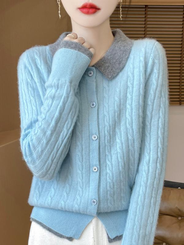 カーディガン レディース 秋冬 韓国ファッション 純ウール 100% バイカラー 襟付き テーラードカラー ニット スクール風 スリムフィット 着回し おしゃれ 通勤 オフィス カジュアル 長袖