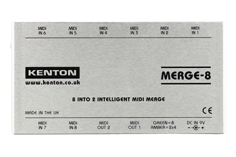 トピックスショッピングクレジット分割48回払いまで金利手数料0%!期間限定 2025年11月30日まで30,000円(税込)以上のお買い物が対象となります。本キャンペーンはクレジットカードでのお支払いは対象外となります。詳しくはお問い合わせください。アイテム説明KENTON Electronics MERGE-8 (マージ エイト)は入力された最大8系統のMIDI信号を1系統にまとめて出力するMIDIマージボックスです。複数のMIDIキーボードやMIDIコントローラーで 1つの MIDI音源をコントロールしたい場合など、複数のMIDI信号を1つにまとめることができます。また本体のボタンを押してモードを切り替えることにより、2つの独立した 4入力1出力の MIDI マージボックスとして使用することもできます。各MIDI IN端子にはそれぞれ独立したドライバー回路とノイズを除去し正確な信号の伝達を実現する補正回路を搭載した信頼性の高い回路設計になっています。MIDIクロック、MIDIアクティブセンス、SysExデータの混在によるトラブルを回避するマスター機能を装備しています。本体は美しいヘアライン仕上げの頑丈なアルミ筐体を採用。電源はACアダプターを使用するので面倒な電池切れの心配が無く、安定した動作を約束します。電源を入れると本体背面のActive LEDが点灯、MIDI 信号を受けるとLEDが点滅します。MERGE-8は「8入力・2出力モード」と「4入力・1出力 x2 モード」の2種類のモードを備えています。モードの切り替えは本体手前側、電源ジャック横のスイッチを押して切り替えます。スイッチはシャーシの内側にあるので、ボールペンなど先端が細い物で押して切り替えます。モードはこの2種類のみとなっており、チャンネルの割当を任意の数(6入力と2入力など)に切り替えたり、ルーティングを変更することはできません。<最大8系統の IDI信号を1系統にまとめて出力>IN 1?8 が OUT1と2から出力されます。2つの MIDI 出力は同じ信号が出力されます。<最大4系統のMIDI信号を1系統にまとめて出力 x2>IN 1?4 は OUT1 から、IN5~8 は OUT2 から出力されます。●接続端子: MIDI IN x8 MIDI OUT x2 DC IN 9V●外形寸法 / 重量: 外形寸法:155 x 80 x 32 mm(ノフ?、コ?ム足、突起含) 重量:220g (ACアタ?フ?ター含ます?)納期について売却時は迅速に商品情報の削除を心掛けておりますが、ショッピングページの更新までにタイムラグが生じ、ご注文のタイミングによっては商品のご用意ができない場合がございます。あらかじめご了承くださいますようお願い申し上げます。最強配送対象商品以外、納期のご確認はご注文前に「商品についての問合わせ」よりお問い合わせください。