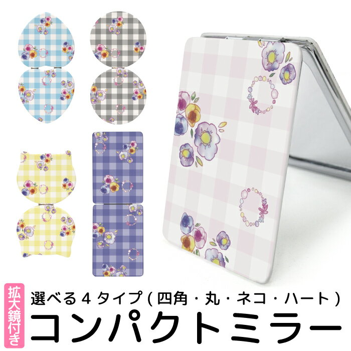 ミラー 鏡 コンパクト 手鏡 拡大鏡 可愛い 折りたたみ 可愛い 携帯 コスメ チェック 花柄 ギンガム フラワー 猫型 丸型 ハート型 kgm026