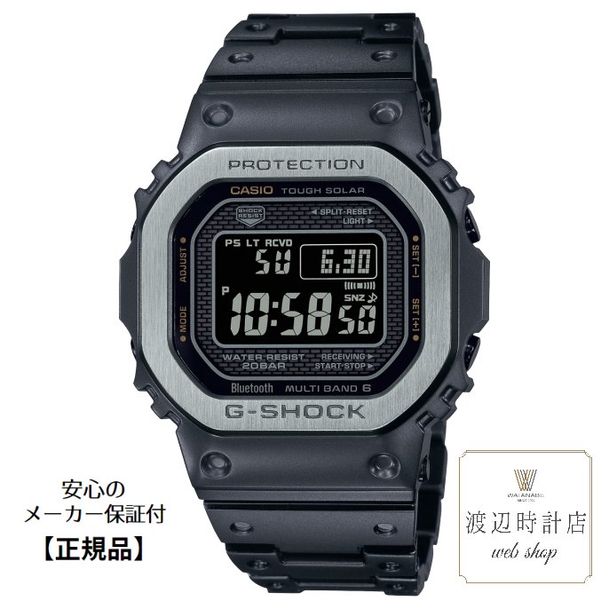 駆動方式(腕時計)ソーラー基本情報 ケースサイズ(縦×横×厚さ) 49.3 × 43.2 × 13 mm 質量 167 g ケース・ベゼル材質 ステンレススチール バンド メタルバンド(ステンレススチール) 無垢バンド ワンプッシュ三つ折れ式中留 構造 耐衝撃構造(ショックレジスト) 防水性 20気圧防水 時刻修正 電波時計 日本・北米・ヨーロッパ・中国地域対応 MULTIBAND6 使用電源・電池寿命 タフソーラー(ソーラー充電システム) モバイルリンク/アプリ連携機能モバイルリンク機能(対応携帯電話とのBluetooth通信による機能連動) アプリ 「G-SHOCK Connected」対応外装ガラス 無機ガラス 裏蓋 スクリューバック 表面加工 ブラックIP(ケース部) ブラックIP(バンド部) バンド装着可能サイズ 150〜205mm時計機能ワールドタイム ワールドタイム5本:世界39都市(39タイムゾーン、サマータイム自動設定機能付き)+UTC(協定世界時)の時刻表示、ホームタイムの時刻入替機能付き ストップウオッチ ストップウオッチ(1/100秒(1時間未満)/1秒(1時間以上)、24時間計、スプリット付き) タイマー タイマー(セット単位:1秒、最大セット:24時間、1秒単位で計測) アラーム/時報 時刻アラーム5本(1本のみスヌーズ機能付き)・時報 ライト LEDバックライト(フルオートライト、スーパーイルミネーター、フェードイン・フェードアウト、残照機能、残照時間切替(2秒/4秒)付き) ライトカラー LED:ホワイト カレンダー フルオートカレンダー 操作音ON/OFF切替機能 操作音ON/OFF切替機能 パワーセービング機能 パワーセービング機能(暗所では一定時間が経過すると表示を消して節電します) バッテリー表示/警告 バッテリー充電警告機能 駆動時間 フル充電時からソーラー発電無しの状態での駆動時間 機能使用の場合:約10ヵ月 パワーセービング状態の場合:約22ヵ月 精度 ※電波受信が行われない場合や、スマートフォンと連携しない場合は、通常のクオーツ精度(平均月差±15秒)で動作します。 その他機能 12/24時間制表示切替 日付表示(月/日表示入替) 曜日表示(英・西・仏・独・伊・露の6ヵ国語切替) 時刻修正詳細 ホームタイム都市(受信機能対応都市)/受信電波 東京/日本の標準電波JJY40・JJY60 ロサンゼルス、デンバー、シカゴ、ニューヨーク、ハリファックス/アメリカの標準電波WWVB ロンドン、パリ、アテネ/イギリスの標準電波MSF・ドイツの標準電波DCF77 香港/中国の標準電波BPC 電波受信機能:自動受信(最大6回/日)(中国電波は最大5回/日)/手動受信、 <日本>受信電波:JJY、周波数:40kHz /60kHz(福島/九州両局対応モデル) <北米地域>受信電波:WWVB、周波数:60kHz <ヨーロッパ地域>受信電波:MSF/DCF77、周波数:60kHz /77.5kHz <中国>受信電波:BPC、周波数:68.5kHz *ホームタイム設定を受信可能な都市に設定すると、都市に合わせた局を受信します。尚、時差は選択した都市によって設定されます。初代G-SHOCK「DW-5000C」の遺伝子を受け継ぐフルメタルモデル「GMW-B5000」がベース。「マルチフィニッシュドブラック」をテーマに、ブラックIPと様々な仕上げ加工を駆使してデザインしたブラックカラーモデルです。 ベゼルとバンドにホーニング加工を多用しつつ、側面にはヘアライン仕上げを採用。バンドの斜面やビス、ボタンなどはミラー仕上げを施した後に、全体にブラックIP処理を施すことで、仕上げの違いが生み出す黒の風合いを楽しめるデザインとなっています。更にベゼルの天面に再研磨を施すことで、下地のステンレスを露出させています。また、ベゼル天面のカラーと調和させるため、ブラックIPはGMW-B5000GD-1JFよりも一段階明るい色味を採用しています。ベゼル全体にホーニング処理を多用しつつ、 側面にヘアライン仕上げ、ビス、ボタンなどにミラー仕上げを施した後、ブラックIPコーティングをしています。 さらに、ベゼルの天面に再研磨を施し、ブラックIPをヘアライン加工で削り落とすことで、下地のステンレスを露出させ、 刻印部分にのみIPカラーを残すなど、仕上げの違いが生み出す黒の風合いを楽しめるデザインに仕上げました。こだわりが行き届いたバンド、ケース仕上げ!バンドは、ホーニング処理をベースに、細部への仕上げ分けでメタルの美しさを高めました。 駒やバックルの側面にはヘアライン仕上げ、斜面にはミラー仕上げを採用。 スクリューバックの裏蓋には、ミラー仕上げとDLCコーティングを施しています。【創業100年の時計店】渡辺時計店はG-SHOCK正規販売店です。
