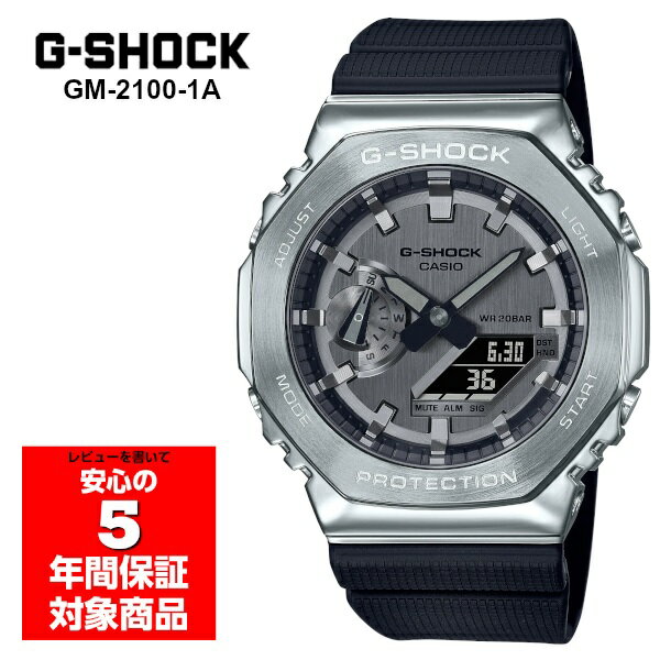 [当店5年間保証対象]G-SHOCK GM-2100-1A メンズ 腕時計 アナデジ ブラック メタル Gショック ジーショックG-SHOCKの初代モデル“DW-5000C”にも採用された“八角形フォルム”を継承するGA-2100シリーズから、メタル素材を採用したモデルです。ベゼルカバー部分に硬質なステンレス素材を採用。ステンレスのベゼルに、円周状のヘアライン仕上げを施し、シックなデザインとなっています。また、文字板に蒸着処理を施し、GA-2100らしいシンプルデザインをシャープかつスタイリッシュに引き上げました。更にバンドには徐々に変化するチェッカーパターンのテクスチャをさりげなく入れ、カジュアルな印象の樹脂バンドに上質感をプラスしています。初代から受け継がれるコンセプトはそのままに、時計としてのクオリティを追求し外装や装着性の進化に磨きをかけたモデルです。<主な機能・特徴>・ショックレジスト(耐衝撃構造)・20気圧防水・薄型、軽量のケースを採用基本情報・ケースサイズ(縦×横×厚さ):49.3 × 44.4 × 11.8 mm・質量:72 g・ケース・ベゼル材質:樹脂/ステンレススチール・樹脂バンド・防水性:20気圧防水・電池寿命:約3年外装・風防:無機ガラス・バンド装着可能サイズ:約14.5cm〜21.5cm時計機能・ワールドタイム:世界48都市(31タイムゾーン、サマータイム設定機能付き)+UTC(協定世界時)の時刻表示・ストップウオッチ(1/100秒(1時間未満)/1秒(1時間以上)、24時間計、スプリット付き)・タイマー(セット単位:1秒、最大セット:24時間、1秒単位で計測)・時刻アラーム5本・時報・ダブルLEDライト:文字板用LEDライト(スーパーイルミネーター、残照機能、残照時間切替(1.5秒/3秒)付き)、LCD部用LEDバックライト(スーパーイルミネーター、残照機能、残照時間切替(1.5秒/3秒)付き)・ライトカラー:ホワイト・フルオートカレンダー・操作音ON/OFF切替機能・精度:平均月差±15秒・12/24時間制表示切替・時刻修正詳細・針退避機能(針が液晶表示と重なって見づらいときは、針を液晶表示の上から一時的に退避させることができます)付属品/保証・箱・説明書(外国語と日本語コピー)・メーカー1年保証