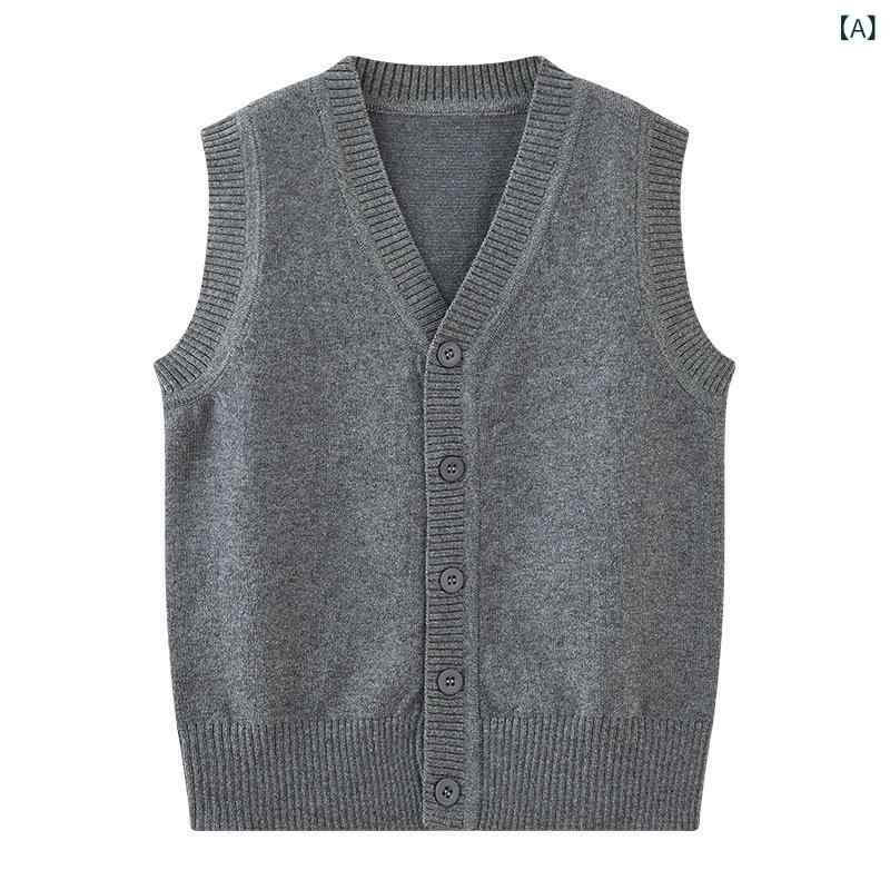 ニットベスト キッズ 男の子 女の子 Vネック 無地 ノースリーブ 綿 韓国風 ジレ トップス 通学 普段使い シングルボタン ブラック グレー ネイビー