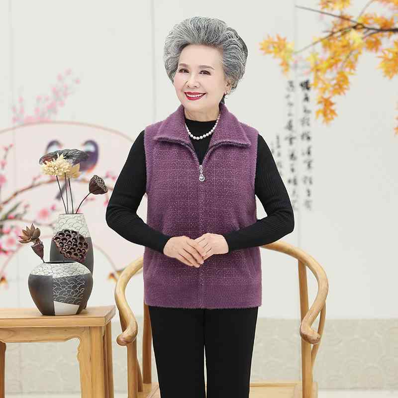ニットベスト レディース ミンク 秋冬 中高年向け おばあちゃん チェック柄 ジップアップ カーディガン 厚手 暖かい パープル 皮紅 棗紅 墨緑