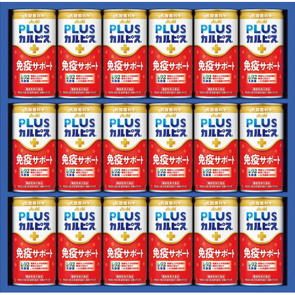 ギフトにもご自宅用にもおススメ! 免疫機能の維持に役立つL-92乳酸菌配合。 「カルピス」の甘ずっぱいおいしさを楽しめる「PLUSカルピス免疫サポート」を詰め合わせた乳性飲料ギフトです。 【機能性表示食品】 ■商品内容:PLUSカルピス免疫サポート190g×18缶