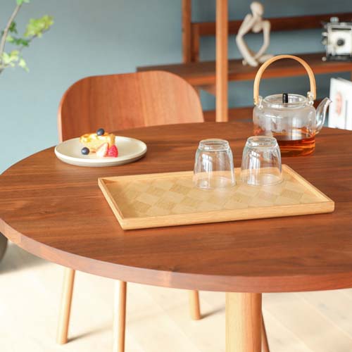 橋本達之助工芸のウッドライフトレーは、FRP樹脂(ウレタン塗装)を使用し、110℃までの耐熱性と抗菌仕様を備えています。45cmの長さで、様々な用途にお使いいただけます。