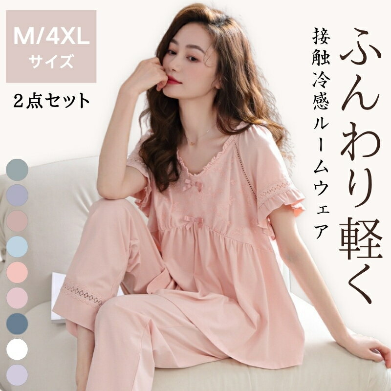 ルームウェア レディース パジャマ 上下セット パンツ 半袖 レース コットン 部屋着 女の子 涼しい 可愛い ナイトウエア シンプル 無地 薄手 リラックスウェア 夏用 軽量 接触冷感 涼感 速乾 通気性 大きいサイズ 夏