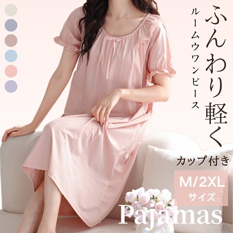 ルームウェア レディース パジャマ カップ付き ワンピース コットン 部屋着 女の子 可愛い シンプル 無地 リラックスウェア 夏用 軽量 涼感 速乾 通気性 大きいサイズ ロング丈 胸パッド付き 夏 オールシーズン