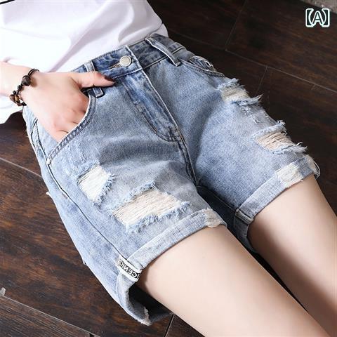 デニムショートパンツ 韓国 ストレート レッグ 万能 デニムショートパンツ レディース 大きいサイズ ハイウエスト ゆったり 2025年 スリミング ホール ホット パンツ