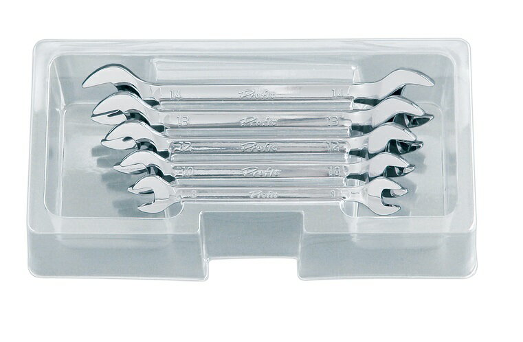 KTC(KYOTO TOOL) 京都機械工具 プロフィットツール スパナセット [5本組] TS305●中味が見えるスケルトンタイプの樹脂ケースと収納トレイ付きです。●先端部をテーパー形状にし、従来品に比べ厚さを薄く、特に先端部分を薄くしました。●口径サイズは1サイズのみで、片側のみ25°の立ち上がり角度を設定。●各種機械のダブルナット締緩作業にも便利です。●従来のスパナが使いにくい場所、自動車のキャブレター回りやマニホールド取付け部分など、特に狭い場所やボルト・ナットが薄い場合などの作業に有効です。