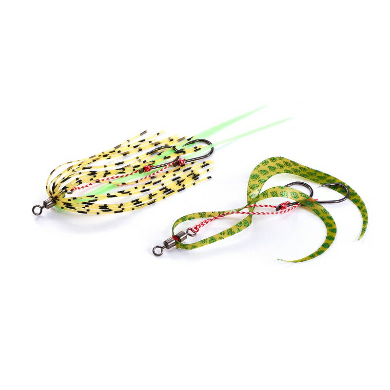 仕様表あらゆる状況を、攻略するタイラバにおいて、天候や潮汐など、状況変化のポイントはいくつもあります。マッケローニに標準搭載されているストレートタイプは、ナチュラルなアクションでオールラウンドに使うことを想定していますが、潮止まり等でどうしてもアピールが足りない場面が出てきます。そのような状況ではカーリータイプがオススメ。強波動を発生させつつ、スカートを無くすことで全体のシルエットを小さくしています。「マッケローニ スペアパーツキット」はストレートタイプとカーリータイプの使い分けであらゆる状況を攻略します。Jackson Maccheroni Spare Parts Kitジャクソン マッケローニ スペアパーツキット●カラー:KWG 食わせグリーン詳細はこちら