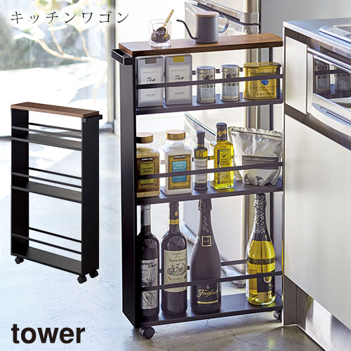 タワー キッチンワゴン キャスター付き スリム 可動式ワゴン ホワイト/ブラック KWG450015