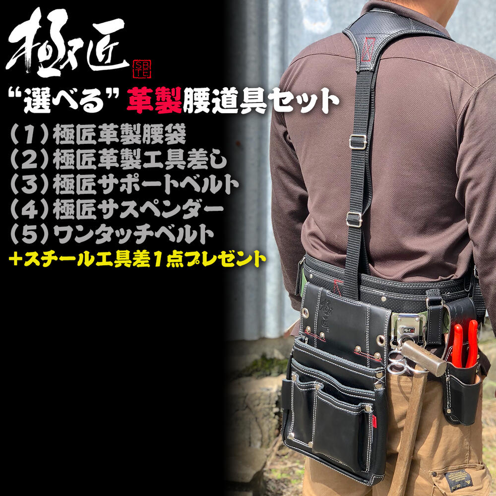 極匠 [当店企画] 選べる革製腰道具セット サポートベルト サスペンダー付きオリジナルセット 革製腰袋 黒革 白革 釘袋 黒皮工具差し スチール工具差しプレゼント 鳶 大工 型枠 職人 腰道具 かっこいい GL GK WGK GTH ベストツール