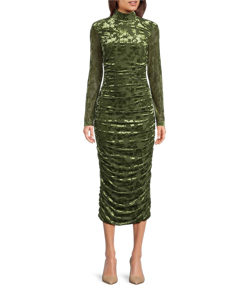 バッジェリーミシュカ レディース トップス ワンピース ボディコンワンピース ギャザー ベルベット Badgley Mischka Kendall Velvet Burnout Ruched Long Sleeve Bodycon Dress Olive オリーブ
