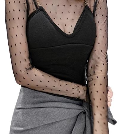 シアートップス レディース 春秋 丸首 ハーフハイネック 長袖 メッシュ レース 透け感 レイヤード プルオーバー スリム 柔らかい おしゃれ 総柄 水玉 大きいサイズ 黒 白