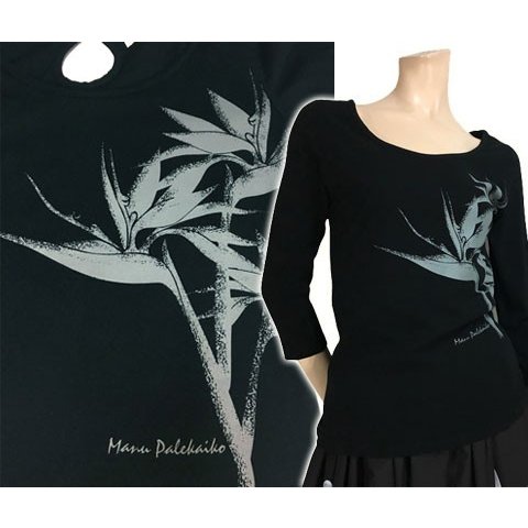 Kapaliliオリジナル ゆったりタイプ 七分袖Tシャツ バードオブパラダイス-グレー ブラックKOT155