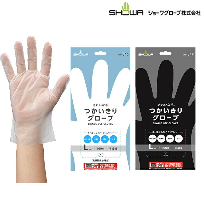 ショーワグローブ 【846 / 847】 きれいな手 ポリ手袋 100枚 入り 半透明 ブラック | ボックス フック掛け S M L サラサラ べたつかない 左右兼用 パウダーフリー ポリエチレン 伸びる フィット 衛生 対策 お掃除 掃除 調理 食品 産業 介護 清掃 毛染め DIY