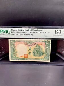 ND(1941) 中国 5Chiao PMG 64EPQ 満州国中央銀行ブロック 136 紙幣。