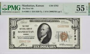 1929年 カンザス州マンハッタン第一国立銀行 $10 1801-1 CH. 3782 PMG AU55 EPQ