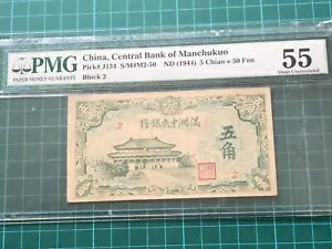 レア 1944 (ND) 中国満州国中央銀行 50 セント紙幣 PMG 55 AU