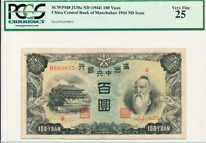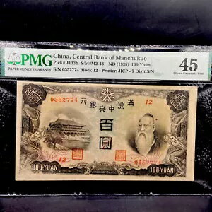 ND(1938) 100元満州国中央銀行S/N 0552774 PMG 45紙幣。