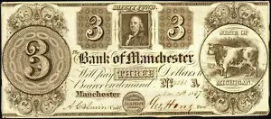 1857 ミシガン州マンチェスター銀行 3.00 ドルの廃止された紙幣