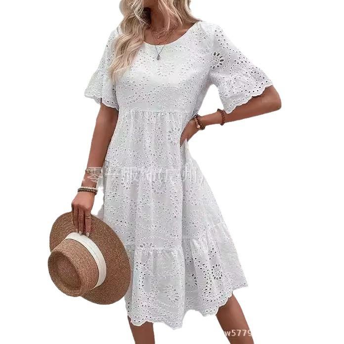 ワンピース レディース Aライン 半袖 ひざ丈 ミドル丈 コットン 刺繡 レース 镂空 白 ホワイト ブルー ピンク 浅绿色 黒 ブラック 無地 カジュアル