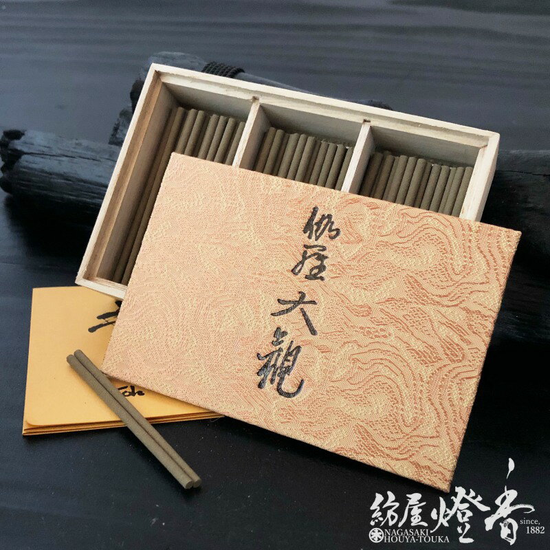 【特徴】 「至上の宝」とされた香木伽羅の深遠な薫り 上質で辛み・深みのある沈香・伽羅をたっぷり用い、白檀・生薬系香料がさらにその魅力を高めます。 香りの王者が誇る奥ゆかしく幽玄の香りを存分に聞くことができるお香「伽羅大観」。 この、えも言われぬ芳香は、悠久の大自然の営みの中で育まれます。 「伽羅大観」は、香木・沈香のなかでも最高とされる伽羅を用いて練り上げた、高雅な香りのお香です。 往にし方より、「至上の宝」として重宝された深遠な香りをご堪能下さい。 穏やかにお部屋に香りが漂います。 こちらはお試し「スティックミニ寸20本入り」タイプです。 お客様をお迎えになられる際に玄関や、広いお部屋などでその奥深な薫りをお楽しみください。 形状のこと異なるご用意がございます。 『日本香堂・香木の香りシリーズ【全商品】』 【お香の焚き方】 火を付け、炎を消して香立てに置き、灰が飛ばないように大きめの受け皿をしてお楽しみ下さい。 香炉に灰を入れてお使いの場合は、灰の上に直接置いて下さい。 【和の伝統 香木の香り シリーズ(お香)】 「毎日白檀(まいにちびゃくだん)」 良質とされるインド産の白檀えお豊富に用い、漢方薬にも用いられる香原料を生かした重厚感のある香り。 「特製白檀香(とくせいびゃくだんこう)」 優美な気品高い香木「白檀」の香りをお楽しみいただけるシリーズです。天然の香料をふんだんに使った、より本格的な白檀の甘い香りです 「沈香寿山(じんこうじゅざん)」 さっぱりとした味わいの沈香をはじめ、白檀・生薬系香料を豊富に使用しています。天然素材の香りの活きたきりりと深い香りです。 「伽羅金剛(きゃらこんごう)」 甘みのある華やかな味わいの沈香・伽羅を豊富に用い、白檀・生薬系香料を調合しております。優雅で重厚感のある香りです。 「伽羅大観(きゃらたいかん)」 上質で辛み・深みのある沈香・伽羅をたっぷり用い、白檀・生薬系香料がさらにその魅力を高めます。香りの王者が誇る幽玄の香り。 伽羅桃山(きゃらももやま) 入手の難しい甘みのあるベトナム産の沈香を豊富に用いた、華やかな桃山の時代にふさわしい香りです。 「森の香(もりのこう)」 広大な森林の恵みを想起するような「もみ・ひのき・針葉樹」それぞれの香りを伝統と最新の調香技術を用いて練り上げたさわやかな香りのお香です。 【商品詳細】 商品名:伽羅大観(きゃらたいかん) メーカー:日本香堂 香り系統:伽羅の優雅な香り 形状:スティック(ミニ寸) 本数:120本 重さ:約68g(箱含) 長さ:約5.6cm 燃焼時間:約約13分 原料:タブ粉、香料 パッケージ:木箱 箱サイズ:縦6.8cm×横10cm×高さ2.4cm「至上の宝」とされた香木伽羅の深遠な薫り 上質で辛み・深みのある沈香・伽羅をたっぷり用い、白檀・生薬系香料がさらにその魅力を高めます。 香りの王者が誇る奥ゆかしく幽玄の香りを存分に聞くことができるお香「伽羅大観」。 この、えも言われぬ芳香は、悠久の大自然の営みの中で育まれます。 「伽羅大観」は、香木・沈香のなかでも最高とされる伽羅を用いて練り上げた、高雅な香りのお香です。 往にし方より、「至上の宝」として重宝された深遠な香りをご堪能下さい。 穏やかにお部屋に香りが漂います。 こちらはお試し「スティックミニ寸20本入り」タイプです。 お客様をお迎えになられる際に玄関や、広いお部屋などでその奥深な薫りをお楽しみください。 形状のこと異なるご用意がございます。 『日本香堂・香木の香りシリーズ【全商品】』 【お香の焚き方】 火を付け、炎を消して香立てに置き、灰が飛ばないように大きめの受け皿をしてお楽しみ下さい。 香炉に灰を入れてお使いの場合は、灰の上に直接置いて下さい。 【和の伝統 香木の香り シリーズ(お香)】 「毎日白檀(まいにちびゃくだん)」 良質とされるインド産の白檀えお豊富に用い、漢方薬にも用いられる香原料を生かした重厚感のある香り。 「特製白檀香(とくせいびゃくだんこう)」 優美な気品高い香木「白檀」の香りをお楽しみいただけるシリーズです。天然の香料をふんだんに使った、より本格的な白檀の甘い香りです 「沈香寿山(じんこうじゅざん)」 さっぱりとした味わいの沈香をはじめ、白檀・生薬系香料を豊富に使用しています。天然素材の香りの活きたきりりと深い香りです。 「伽羅金剛(きゃらこんごう)」 甘みのある華やかな味わいの沈香・伽羅を豊富に用い、白檀・生薬系香料を調合しております。優雅で重厚感のある香りです。 「伽羅大観(きゃらたいかん)」 上質で辛み・深みのある沈香・伽羅をたっぷり用い、白檀・生薬系香料がさらにその魅力を高めます。香りの王者が誇る幽玄の香り。 伽羅桃山(きゃらももやま) 入手の難しい甘みのあるベトナム産の沈香を豊富に用いた、華やかな桃山の時代にふさわしい香りです。 「森の香(もりのこう)」 広大な森林の恵みを想起するような「もみ・ひのき・針葉樹」それぞれの香りを伝統と最新の調香技術を用