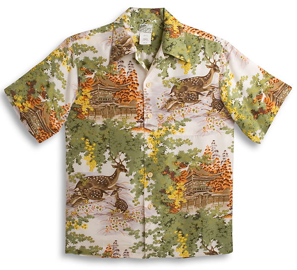 アロハシャツ メンズ レディース LALAKAI ララカイ HL044GR グリーン 京都 金閣寺 鹿 紅葉 和柄 ブランド 高級 人気 おしゃれ ギフト プレゼント お祝 還暦 誕生日 結婚式 父の日 母の日 クリスマス イベント シルク100% 開襟 オープンカラー 送料無料