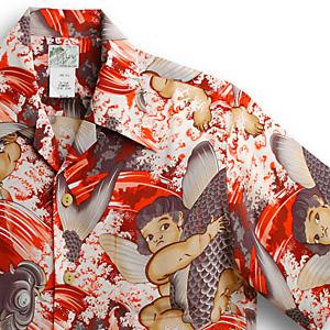アロハシャツ・ララカイ(LALAKAI)|HL-025 天使と鯉|レッド|メンズ|縮緬(ちりめん)シルク|薄手生地|半袖|アロハタワー(アロハシャツ販売) LALA KAI