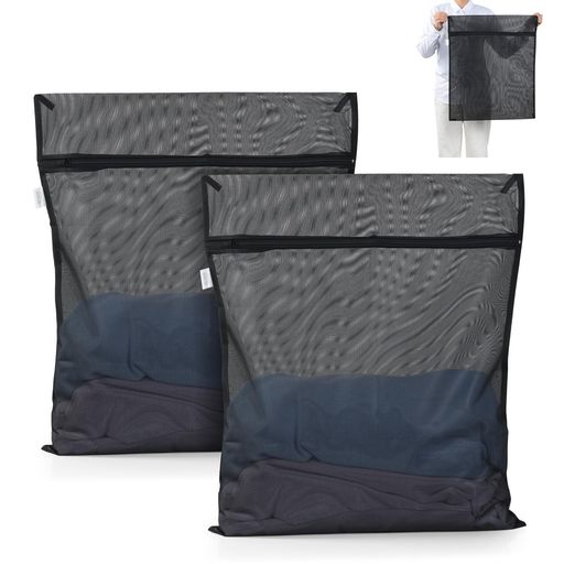 【角型·2枚セット】サイズ:40x50cm。セット:2枚入り。素材:ポリエステル。カラー:ブラック。洗濯ネットは衣類の洗濯がもちろん、旅行や出張時の衣類の仕分けや自宅での衣類の整理などにも活用できます。 【無蛍光】洗剤ネットは洗濯物や肌に優しい無漂白の生成り生地を採用、赤ちゃんや肌が敏感な方でも安心してお使いいただけます。 【細かい綱目付き】細かい綱目の洗濯ネットはデリケートな衣類向け、ビーズ飾りやレース、ラメなどで装飾の入った衣類に適します。もちろん他の衣類も同じく対応します。丈夫のそして水切りの良いメッシュ生地を使用、均一でしっかりしていて、目も粗すぎず細かすぎず、ちょうどいいサイズの穴で汚れを逃してくれます。 【保護カバー付き】保護カバー付きで、ファスナー取っ手の移動を防ぐ、洗濯や乾燥中の服がランドリーバッグから逃すころを防止します。また、ファスナーの金属部分を服に痛みを付けないように設計されます。