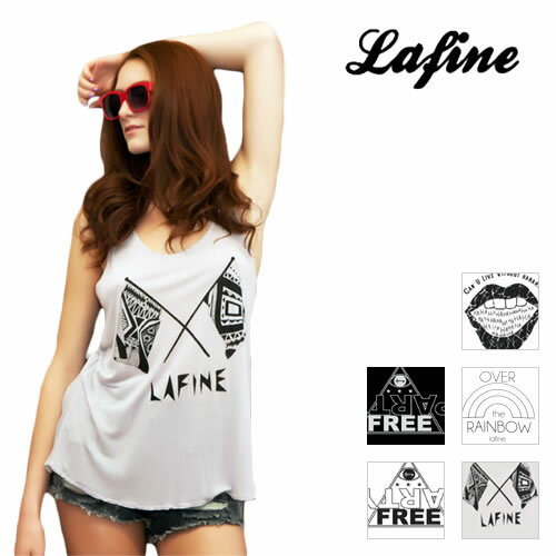 ラファイン タンクトップ トップス レディース ノースリーブ 白 黒 大きいサイズ ヨガ LaFineTank Topユーモアあふれるメッセージロゴやグラフィカルなプリントが目を引くタンクトップ。 ラファインならではの薄手の柔らかい生地、さらりとした軽い肌触りで着心地抜群。とろっとした落ち感のゆったりシルエット。 淡色は透け感があるのでインナー必須、広めの襟ぐりなので重ね着を楽しんでもOK。後ろ着丈の長いバックロングシルエットで、これ一枚でもさらりとスタイリッシュに決まります!メンズライクなコーデにも健康的なセクシーさをプラス。UNK FOOD(ジャンクフード)、american apparel(アメリカンアパレル)、DIESEL(ディーゼル)などを好む方にも人気のブランドですのでプレゼントにも喜ばれる商品です。スキニーデニムやカラーデニムと合わせて。COLOR ※こちらが実物に最も近いお色味ですが、環境によって見え方は異なりますので、ご不安な点はお問い合わせください。SPECブランドLaFine商品名Tank Top生産国アメリカ素材下記参照 ※カラーごとに異なります素材別お手入れ方法 ※下記参照カラー・ハハハ アイボリー(白・透け感あり) 素材レーヨン 100% ・インカフラッグ ライトグレー(薄い灰色・透け感あり)モダール 100%・レインボー アイボリー(白・透け感あり) レーヨン 100% ・パーティーフリー ブラック(黒)・パーティーフリー アイボリー(白・透け感あり) ■SIZE(cm) ※平置き実寸サイズ(スタッフ採寸)※商品によりサイズにばらつきがあります ※採寸方法は下記参照サイズ肩幅胸囲アームホール前着丈後ろ着丈XS3296483758S3398504060M34100524363 ■スタッフ試着DATA 身長:150cm / 体重:40kg / 通常:S身長:160cm / 体重:50kg / 通常:MXS着用後ろ丈はお尻がすっぽり隠れる長さで、胸元がかなり広め。袖口部分もかなり大きいのでインナーは必須です。柔らかい着心地で肌ざわりも気持ち良い☆M着用後ろはお尻に少しかかるくらい、前は腰辺りの着丈でした。めちゃ派手なインナーと合わせて袖や裾からのチラ見せが絶対カワイイ!淡色透け感ありでインナー必須。 ■ご利用可能サービスメール便1点まで可 ご利用方法 ※下記参照(必読) ⇒素材別お手入れ方法 ⇒採寸方法 ⇒メール便ご利用方法